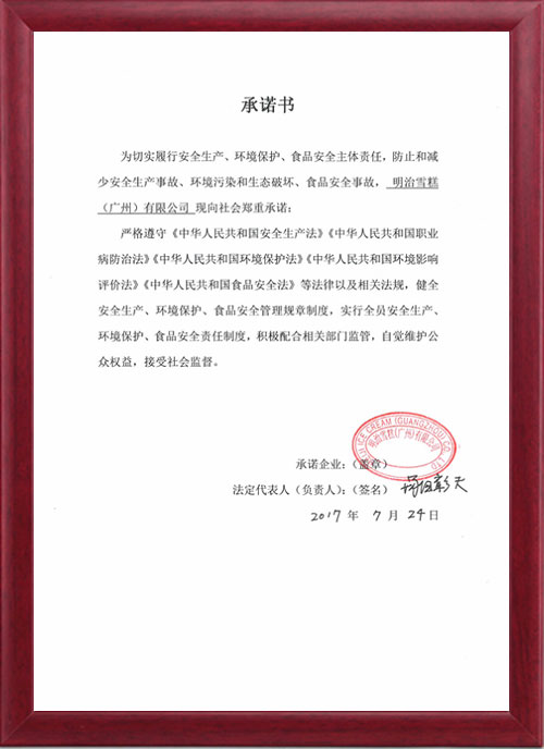 明治雪糕(广州)有限公司严格实施ISO9001、HACCP食品安全质量管理体系和ISO14001环境管理体系,安全预防及质量保证双重机制,确保从供应商开发、原材料采购、验收、生产、检验、仓储和出货符合体系相关要求,并致力于不断生产安全、美味、高品质的雪糕回馈社会。
